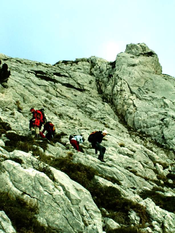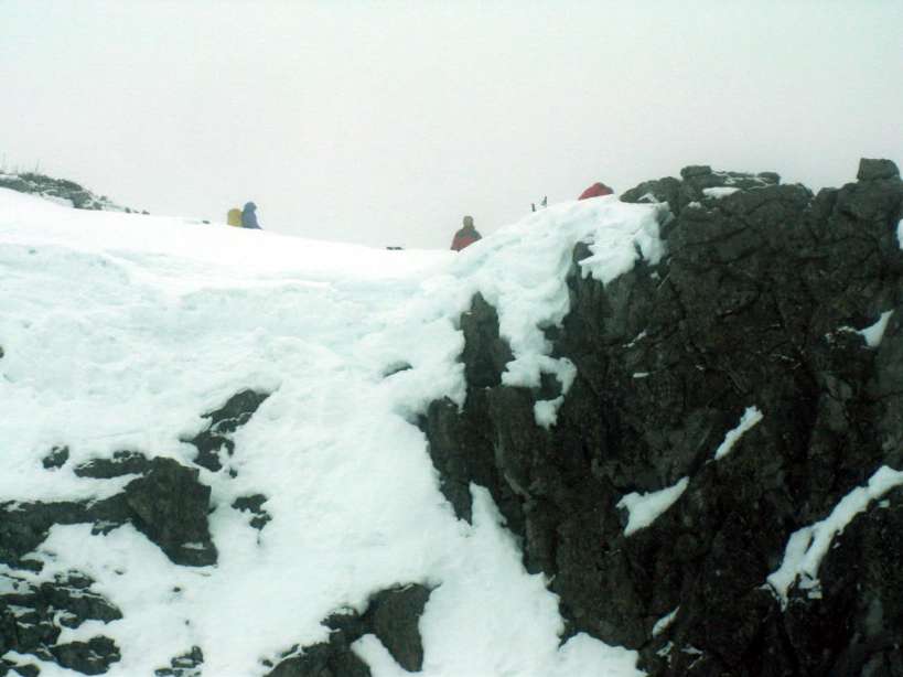 | En un momento dado Arturo afronta un resalte a mi juicio excesivamente expuesto para las condiciones de la roca y nos indica alternativa. Atravesamos una majestuosa franja diagonal de nieve y trepamos por un canalillo entre matas y rocas afiladas. La salida te lleva a la izquierda para después encarar una "rimaya" de unos 3 m. con nieve polvo en la que Arturo abre huella autoasegurándose con el pico del piolet. Yo clavo puños y subo por la huella sin excesiva dificultad. ¡Y esto es todo! Aparecemos en una amplia loma con un amplio hito que señala la bajada justamente por donde hemos subido, sin más misterio que pasar de creer que íbamos a la aventura a darnos cuenta de que seguíamos la ruta normal. El tramito en cuestión debe tener caída de bajada, no sabemos donde acaba la pala, pero como son sólo 3 m. cabe la posibilidad de compartir un piolet... Es igual, seguimos hacia la derecha en medio de la niebla | |||||||||||||||||||||||||||||||||||||