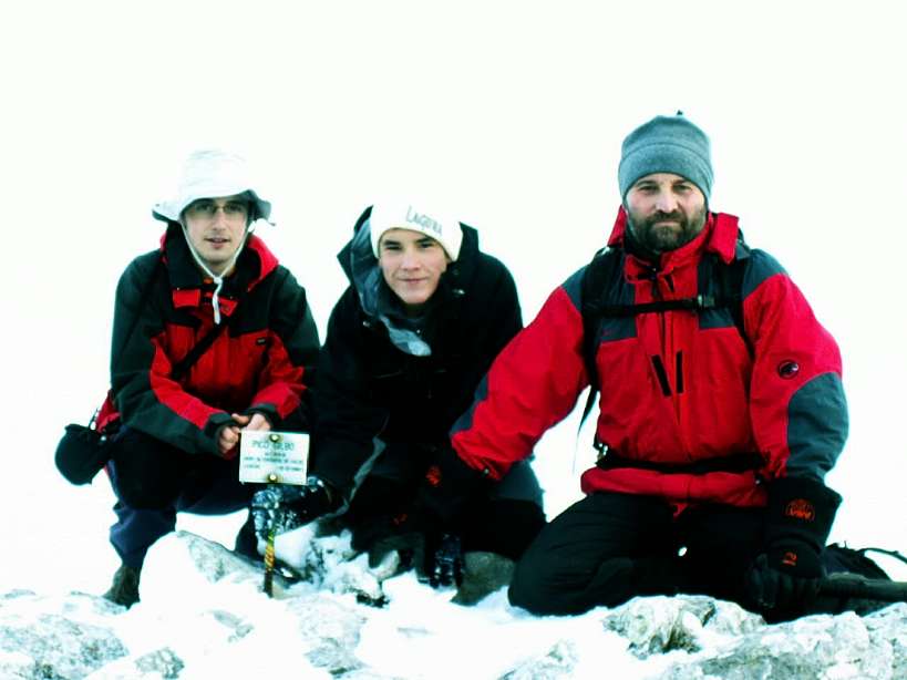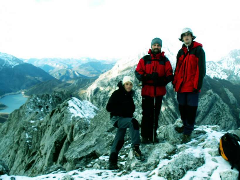 | Los tres chivos: Dani, Zapata y yo (sobre todo ellos dos, que están como dos cabras e impusieron un ritmo de vértigo en la arista final, el paisaje pasaba ante mis ojos como si estuviéramos a bordo del un Ferrari trazando unas curvas peligrosas al pie de un acantilado) | Ahora posando junto a la placa de cumbre |