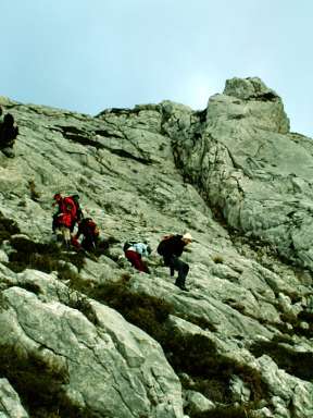 Seguimos avanzando y por fin conseguimos llegar al collado de Bagulloso. En esta zona el grupo se divide y unos deciden dar la vuelta, mientras otros quieren alcanzar la cima. A partir de aquí el camino se hace difícil de intuir y hay que hacer uso de la brújula y la experiencia en alta montaña. Buscando el “camino” y después de andar durante una hora más, aproximadamente, se consigue llegar al pico Yordas (1.967 m.). Aunque la vista que desde aquí se puede contemplar es espectacular, la densa niebla impide apreciarla. Ya solo queda regresar por el mismo camino que hemos venido y tomarnos unas cervezas en uno de los bares que tiene el pueblo de Liegos.