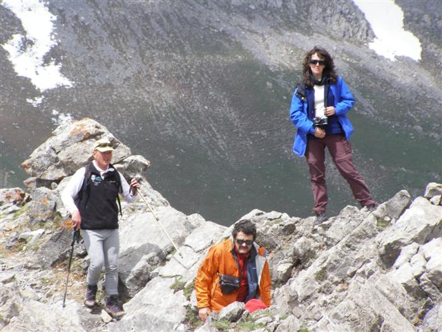 Volvimos a agruparnos en el Collado. Unas ráfagas de viento aceleraron la salida, de los que todavía queríamos más monte, hacia la Ubiña Pequeña (2189 m). Con tiempo despejado y cargando menos peso, empezamos a caminar de forma intuitiva. Llegados a una zona de roca, ascendimos trepando hasta la cumbre. Esta última ascensión fue más corta pero nos obligó a meternos por tramos más delicados. La llegada y las vistas hacia Ubiña y el resto de los valles nos dejaron un inmejorable sabor de boca.