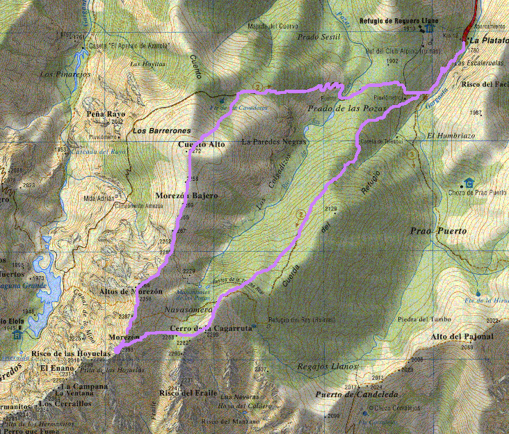 Una vez recorrido el tramo empedrado que sale de la plataforma, nos encontramos un poste indicándonos la dirección hacia la derecha para ir a la Laguna Grande. Nosotros continuamos por la izquierda, avanzando por el Prado de las Pozas dejando a nuestra izquierda la garganta de "Prao Puerto".