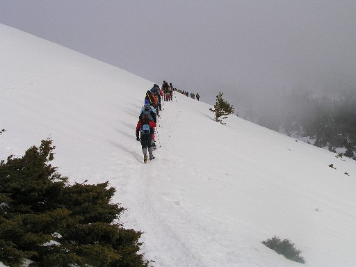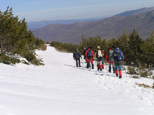 Un poco después de la Laguna grande de Peñalara (2022 m) el grupo se separa. El "grueso del pelotón" sigue la ruta de las lagunas y el resto (6 ó 7) decide subir a Peñalara. Hemos desenterrado el piolet de guerra y vamos ávidos de adrenalina camino de esos tubos aledaños a Peñalara (2430 m). Hacemos nuestra correspondiente canal, casi directa a la cima señera de Guadarrama. Arriba, foto para la posteridad. Un momento de relajo, estiramos las piernas y la vista: la Catedral de Segovia y el Alcázar son perfectamente distinguibles; la Granja y su simetría versallesca, y a los pies del montañon el fabuloso pinar de Valsaín, en la umbría. La siguiente cota, los Claveles (2390 m), con una corta arista que tiene más de alpino que de carpetano. El sol calienta. La nieve funde rápido. La bajada al puerto de los Neveros ( 2094 m) se hace entre extenuante y divertida, está llena de trampas. No sabes cuando vas a meter el cuezo hasta las ingles. Alguno se atora y no va "ni palante, ni patrás". Remontamos el cerro del Nevero, giramos a la izquierda y con pesadez subimos el último repecho, el del Reventón. Topónimo muy ajustado a nuestra circunstancias. Aquí llenamos el buche y bajamos al puerto (2038 m) entre hundimientos y carcajadas. Al fondo, hacia levante, el azul casi añil del embalse de Lozoya, Rascafría y, más cerca, el recogido monasterio de El Paular. Bajamos dejándonos caer, como se deja caer la tarde entre la tranquilidad y la donosura del bosque. Cruzamos el último bosque (poner el nombre del bosque si se sabe), de robles rebollos y llegamos a Rascafría. Son las seis de la tarde. Tomamos algo y, ya en el autobús, entre chanzos y chascarrillos retornamos hacia la urbe.