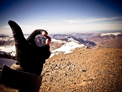Debido a la disparidad de ritmos en el grupo, durante la subida nos dividimos en dos desde casi el primer momento. Los que avanzábamos más aprisa conseguimos llegar a la cima de ‘Jebel Oumsoud’ sobre las 15:00 horas, no sin esfuerzo. El resto no consiguió llegar , ya que el guía nos había advertido que de no alcanzar esta cota antes de esa hora debíamos bajar y no continuar. Así que el resto llegó hasta la mitad de la cresta aproximadamente. En la cima había bastante viento y tuvimos que estar poco tiempo. Y además olvidamos la bandera de Pegaso, un descuido imperdonable…el único que llegó y mostró la chapita de Pegaso fue Nacho.
