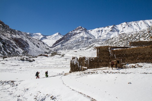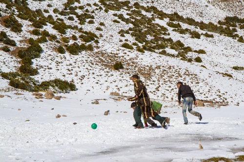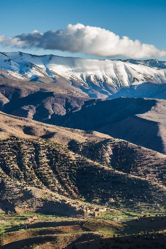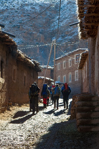 Al día siguiente, contra todo pronóstico, amanecimos con un día espléndido, despejado y soleado. Nuestro gîte, enclavado en el valle de Arous, nos permitía disfrutar de unas espectaculares vistas de las imponentes cimas nevadas que nos rodeaban. Sin duda el contraste entre los arenosos pueblos de casas de adobe y el blanco de las montañas atraía poderosamente nuestra atención. Empezamos a caminar a las 8 de la mañana, ya que la jornada de hoy no es muy larga.
