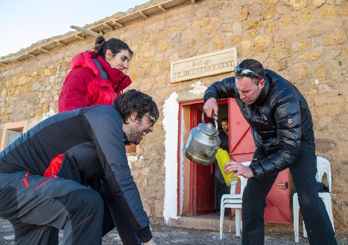 Descendemos al Plato por la empinada ladera norte, y por fin nos adentramos en las montañas nevadas de este espectacular macizo. Llegamos a buena hora al pequeño refugio de Tarkeddyt.